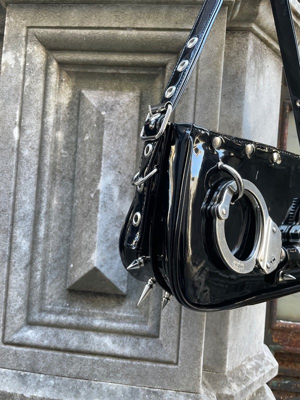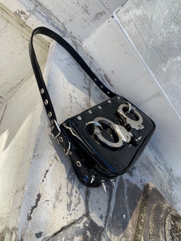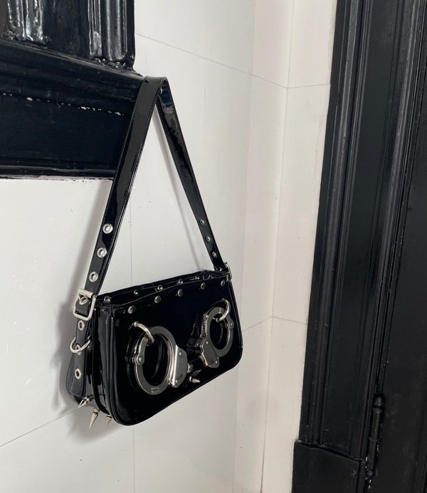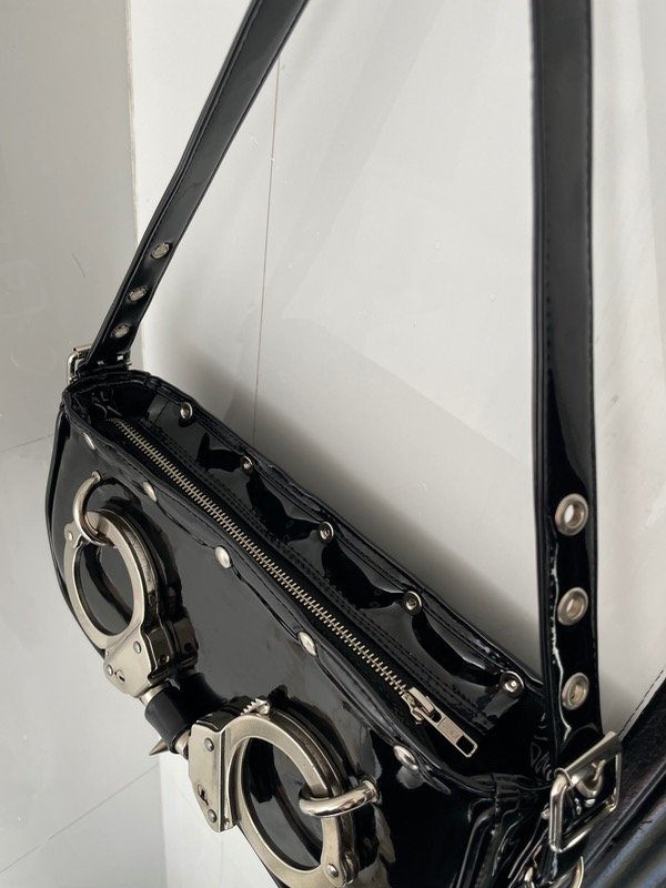 Cartera confeccionada en charol, con vista con cierre Y2K, forrada, con bolsillo interno y correa regulable.